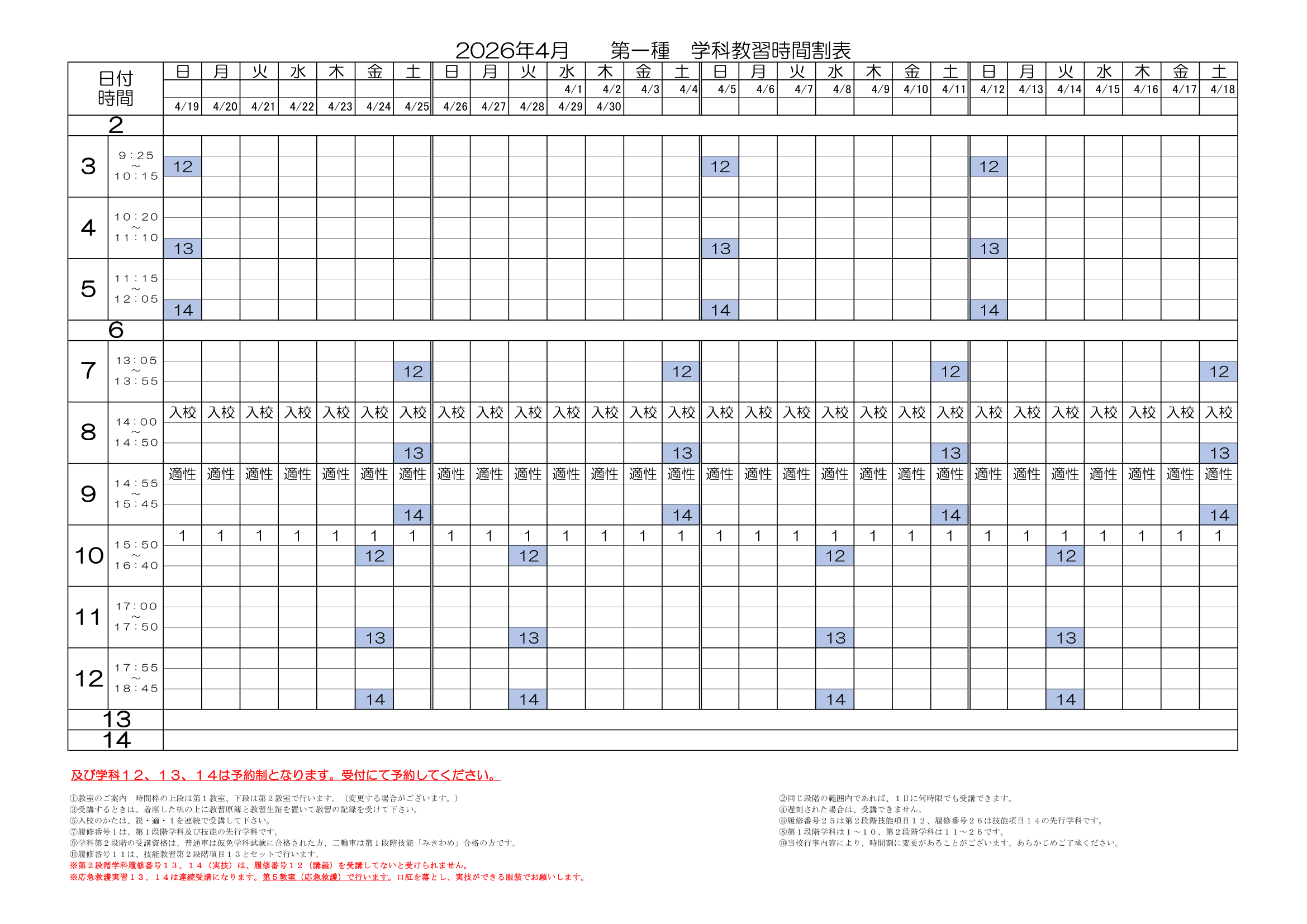 2026年4月 学科予定表